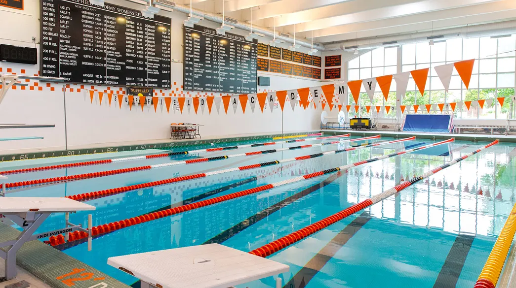 Suffield’s state-of-the-art indoor swimming center features a 25-meter, six-lane pool with a timing system and matrix display, two one-meter diving boards, boys’ and girls’ locker rooms, and floor-to-ceiling windows, all delivering a high standard for swim training and competition.